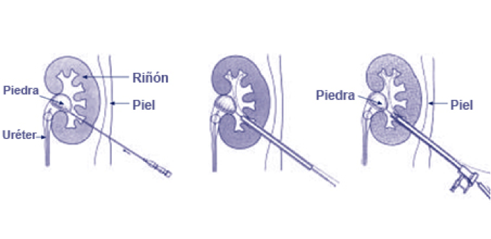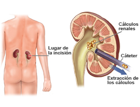 Se trata del mejor procedimiento para eliminar cálculos o piedras renales de gran tamaño (≥20 mm) o cálculos que sean difíciles de encontrar y romper mediante el empleo de la LIC o ureteroscopía. Se trata de un procedimiento quirúrgico realizado bajo anestesia general o espinal (epidural). Se inserta una aguja en el interior del riñón a través de una incisión de 1cm de anchura realizada en la espalda. Posteriormente se inserta un cable guía que atraviesa la aguja para insertarse en el riñón. Se retira la aguja dejando el cable guía en el interior del riñón. A través de este cable guía se inserta un nefroscopio (una cámara con una fuente de luz para visualizar el interior del riñón) para identificar los cálculos, romperlos y extirparlos.
